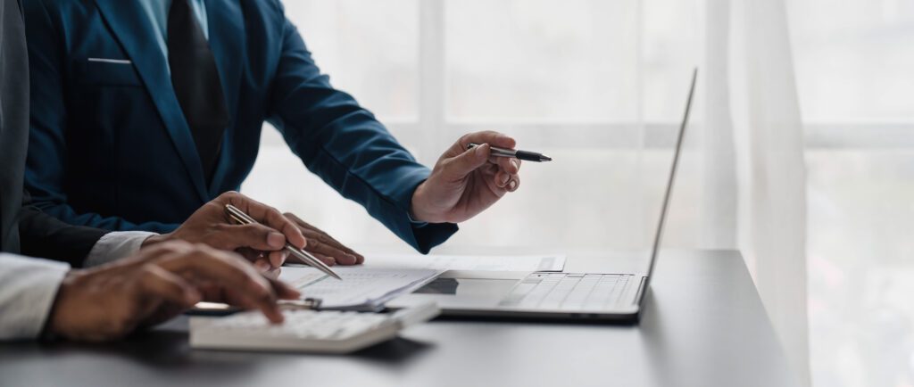 Duas pessoas em ambiente corporativo analisam documentos e dados financeiros sobre uma mesa, utilizando uma calculadora e um notebook. Uma delas aponta para a tela com uma caneta, enquanto a outra faz anotações. A imagem representa um momento de análise e tomada de decisão, destacando a importância da padronização de dados para garantir precisão e eficiência nos processos empresariais.
